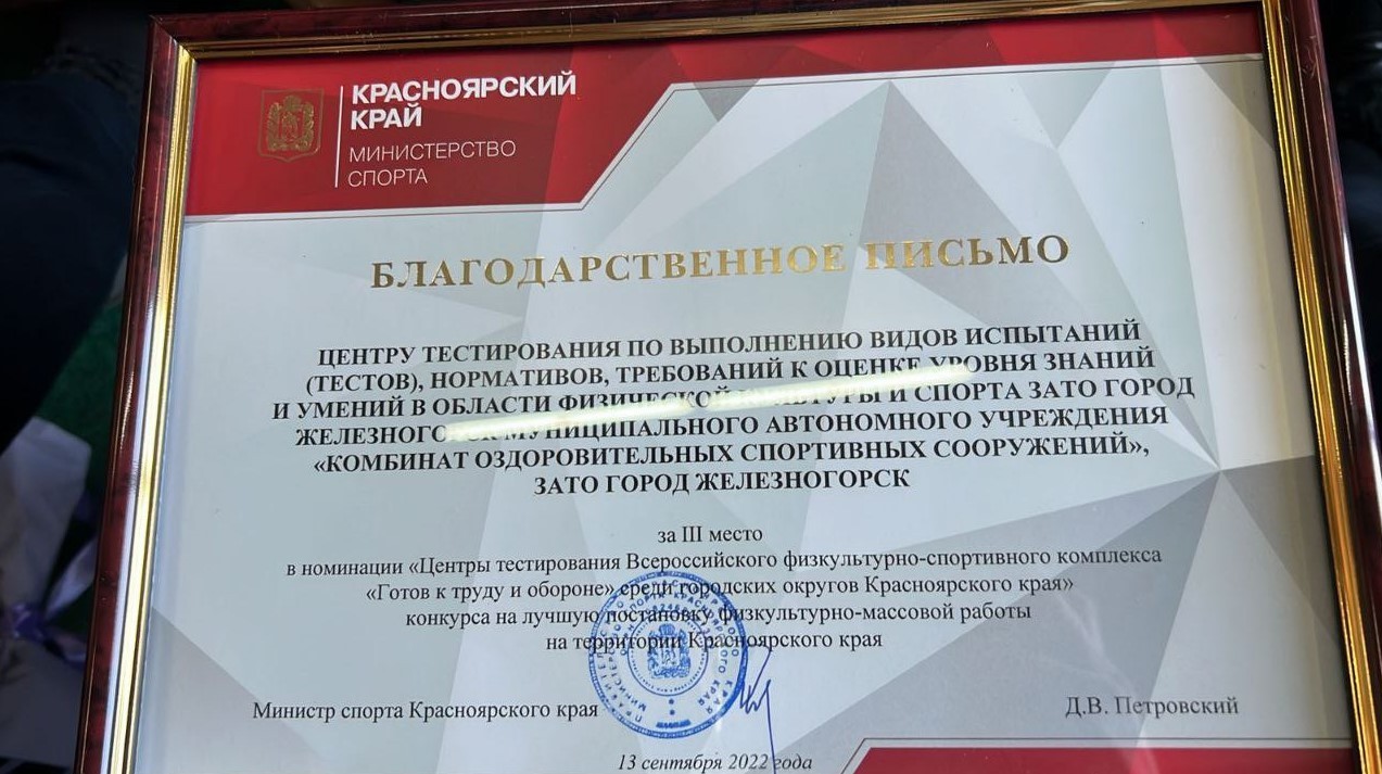 Центр тестирования ВФСК ГТО МАУ «Комбинат оздоровительных спортивных учреждений» ЗАТО г. Железногорск получил награду за третье место среди городских округов Красноярского края.