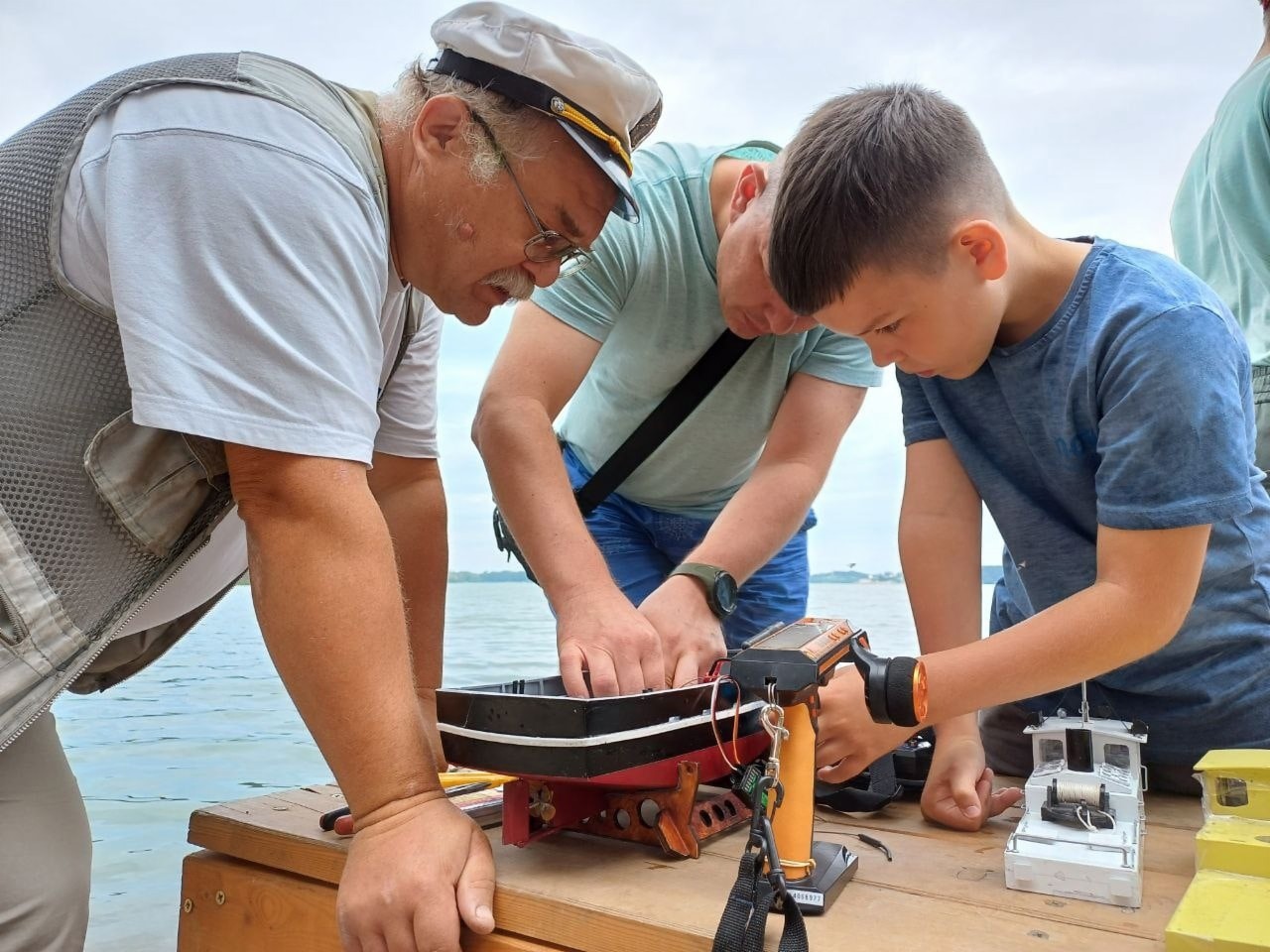 От пирса Нейтрино-парка стартовал парад моделей кораблей. Красиво! Сегодня судомоделистам пришлось настраивать корабли на борьбу с волнами городского озера.