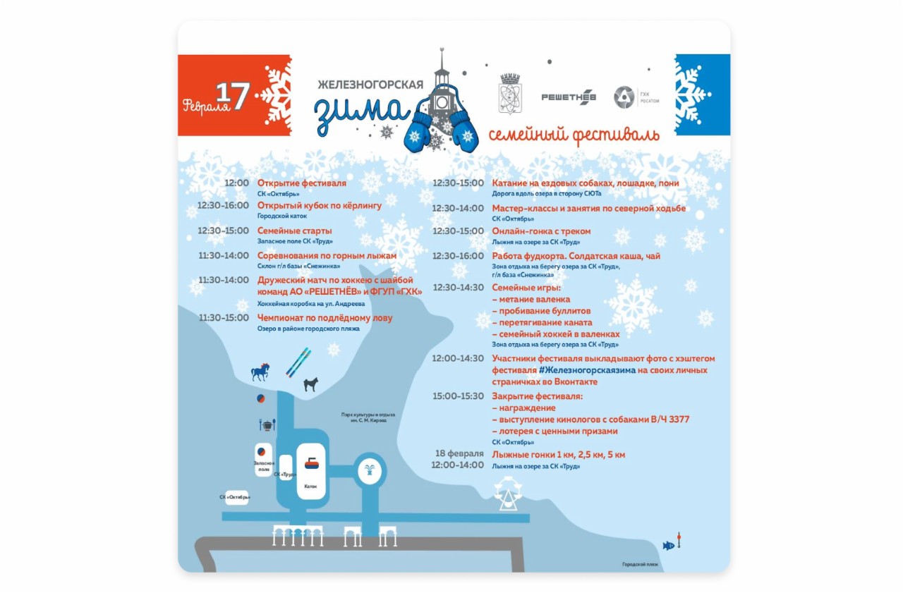Февраль в Сибири может быть тёплым. И вы обязательно убедитесь в этом сами, если придёте на семейный фестиваль «Железногорская зима», который организуют АО «РЕШЕТНЁВ», ФГУП «ГХК» и городская администрация.В субботу, 17 ФЕВРАЛЯ, взрослых и детей ждут подвижные игры и семейные старты, катание на ездовых собаках и лошадках, мастер-класс по северной ходьбе. Также можно будет поддержать свою команду в кубке по кёрлингу, чемпионате по подлёдному лову и дружеском хоккейном матче.