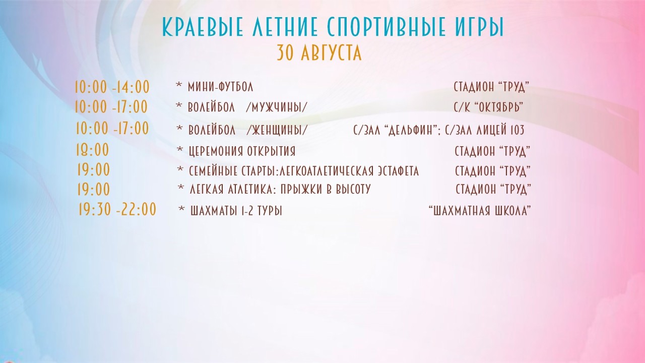 Торжественная церемония открытия пройдет 30 августа в 18.00 на стадионе «Труд».