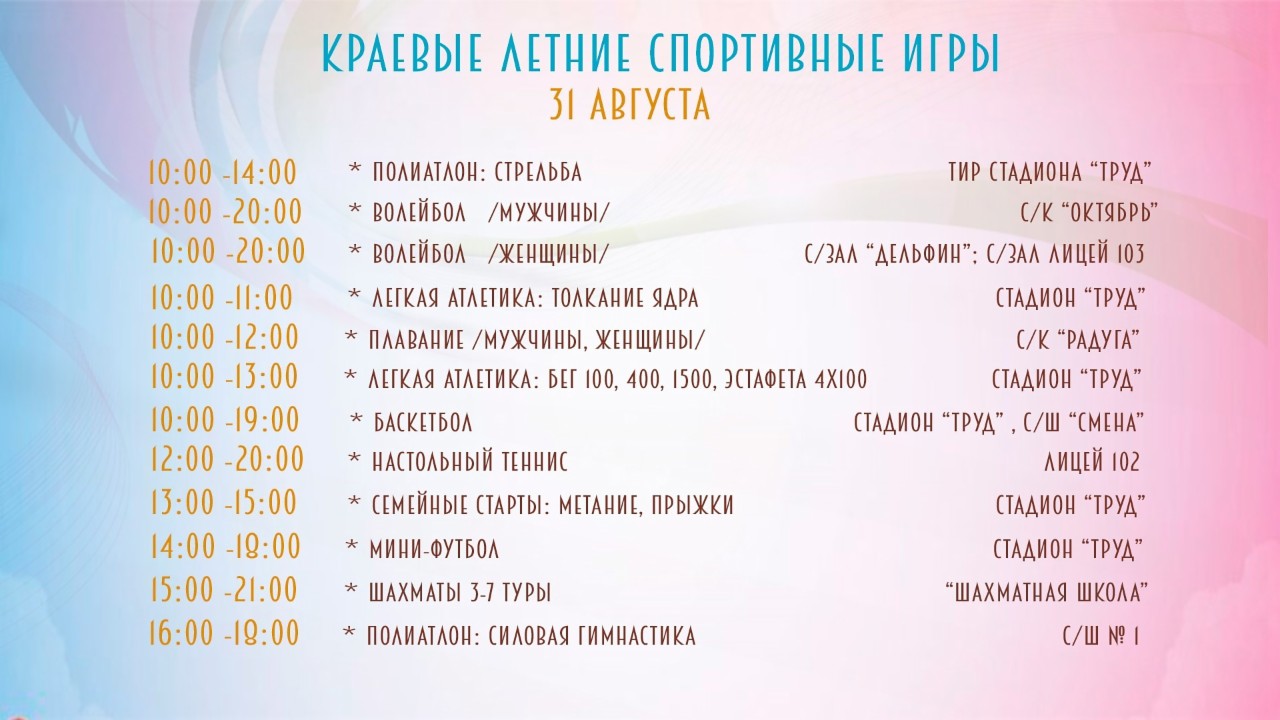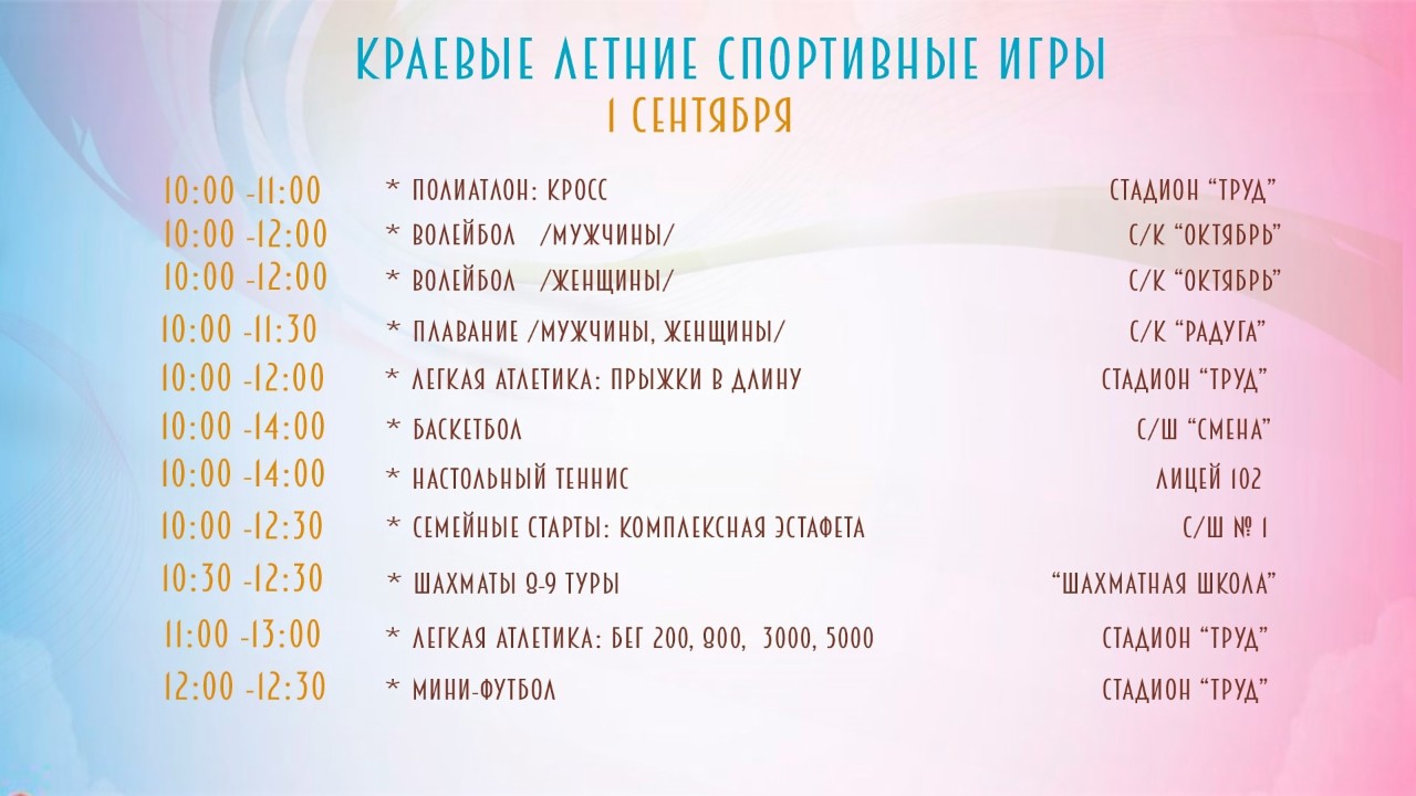Выбирайте любимый вид спорта и приходите болеть за спортсменов. Вход свободный. Подробная программа