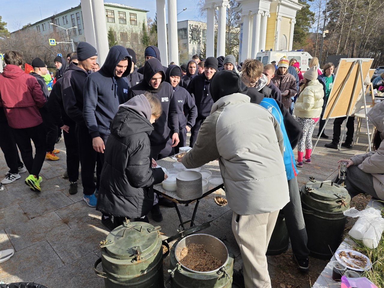 Перед забегом участники разогрелись аэробикой из 80-х, а после финиша всех угостили горячей ароматной кашей с тушёнкой и сладким чаем.