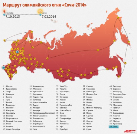 Седьмого октября стартует эстафета олимпийского огня, которая пройдет в 2,9 тыс. населенных пунктов от Калининграда до Владивостока и закончится в день открытия Игр в Сочи. Протяженность маршрута составит 65 тыс. километров. Чести нести главный символ Олимпиады удостоены 14 тысяч факелоносцев. Впервые ее удостоятся и наши земляки: Вячеслав Купрюхин,
