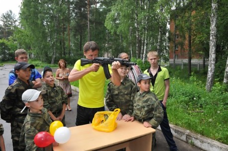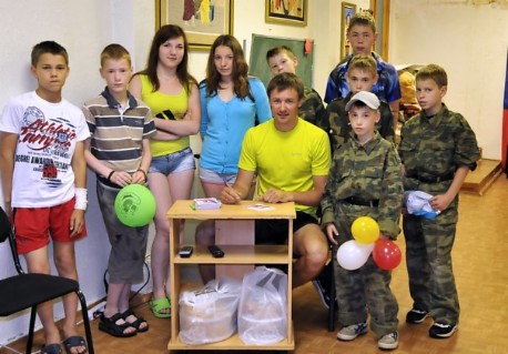 Накануне в детском доме экс-участник российской сборной по биатлону Дмитрий Ярошенко, он же трехкратный абсолютный чемпион мира по летнему биатлону, учил воспитанников меткости стрельбы. (Это они с Евгением Устюговым придумали такой проект).
