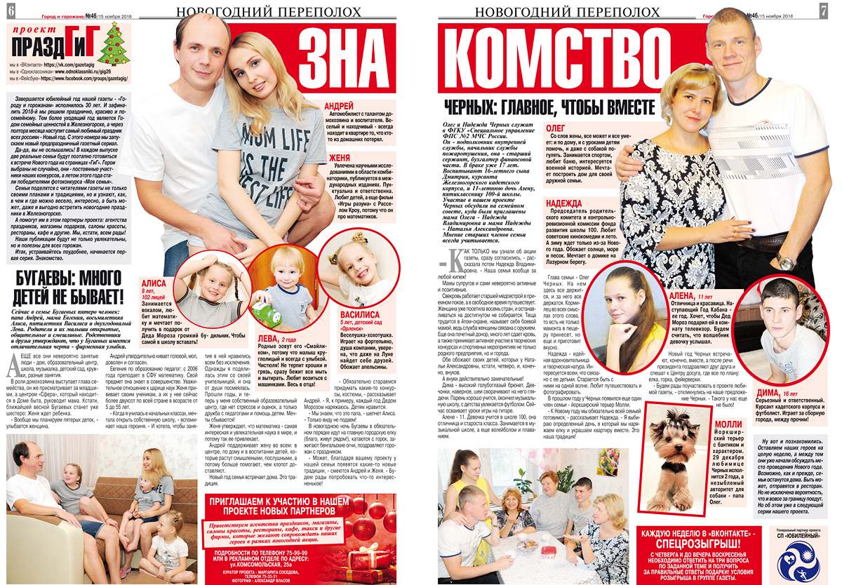 Завершается юбилейный год нашей газеты - «Городу и горожанам» исполнилось 30 лет. И зафиналить 2018-й мы решили празднично, красиво и по-семейному. Тем более уходящий год является Годом семейных ценностей в Железногорске, а через месяц наступит самый любимый праздник всех россиян - Новый год. Поэтому с 46 номера (от 15 ноября) мы запустили новый предпраздничный газетный сериал. Да-да, вы не ослышались! В каждом выпуске две реальные семьи будут поэтапно готовиться ко встрече Нового года на страницах «ГиГ». Герои выбраны не случайно, они - постоянные участники наших конкурсов, а летом этого года стали победителями фотоконкурса «Моя семья». Семьи поделятся с читателями газеты не только своими планами и традициями, но и узнают как, в чем и где можно весело, интересно, а быть может, даже и выгодно встретить новогодние праздники в Железногорске. А помогут им в этом партнеры проекта: агентства праздников, магазины, салоны красоты, рестораны, кафе и другие. Мы, кстати, всем рады!