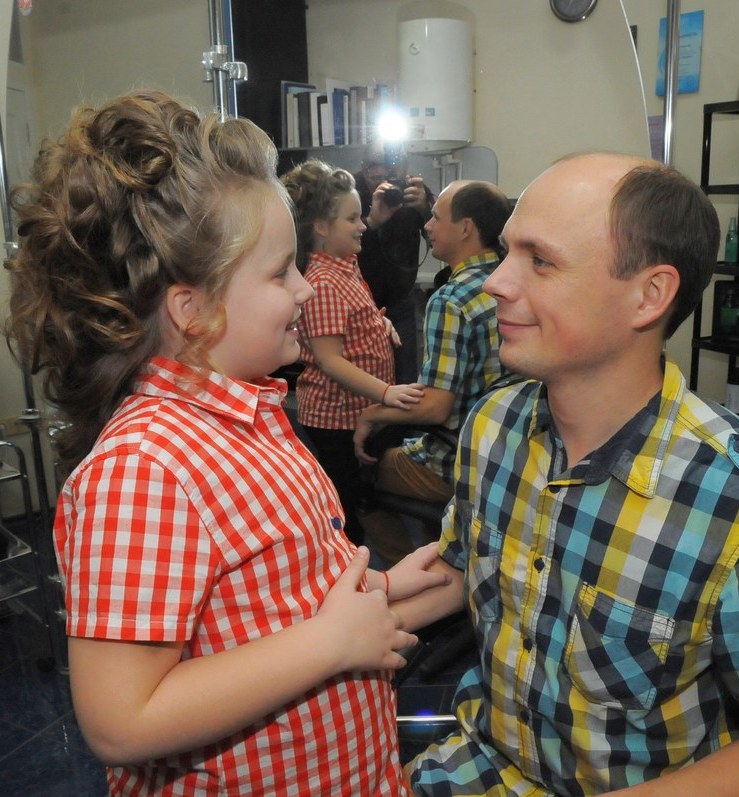 Первыми на прием приехали Андрей Бугаев со старшей дочкой Алисой. Меньше чем через час оба в полном порядке - папа аккуратно подстрижен, а второклассница Алиса, рассматривая свое отражение в зеркале, выносит вердикт: «Круто!»