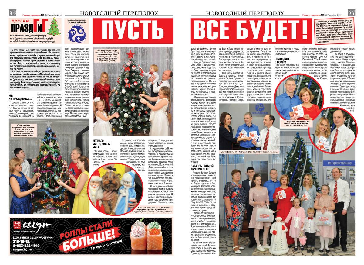 ООО «С/п Юбилейный ГХК»Мы не прощаемся…Подходит к концу 2018-й, а вместе с ним наш ПраздГиГ. Тем, кто только что открыл газету и недоумевает, о чем собственно речь, советуем найти 46-й номер от 15 ноября этого года (электронный архив имеется на сайте «ГиГ») и начать со знакомства с героями проекта - семьями Черных и Бугаевых. И пока неосведомленные читатели осведомляются, мы продолжаем для тех, кто, как говорится, в теме. Итак, перед вами - заключительная часть нашего новогоднего переполоха. Больше мы не станем бегать по стилистам, примерять платья графинь и надевать короны принцесс, не будем баловать суставы фитосборами, печь хлеб и подбирать бижутерию к вечернему платью. Все это уже было, и благодаря замечательным партнерам проекта «ПраздГиГ: Новогодний переполох» получилось весьма достойно. Спасибо всем! Черных: мир во всем мире.jpg)