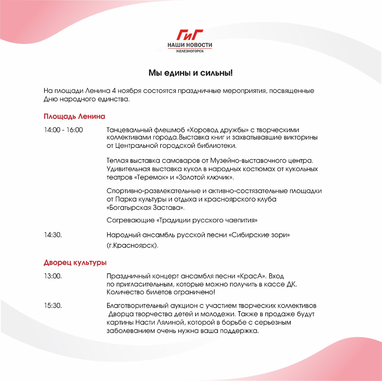 В Железногорске празднование Дня народного единства начнется в 14:00 на площади Ленина.