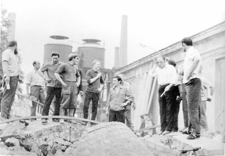Один курьезный момент запечатлел в 70-м году мастер цеха в серии уникальных фотографий. В наследство РСЦ досталось здание бывшей первой котельной комбината. От нее труба в 33 метра высотой очень мешала. Решили, надо ее снести. Горняки, к которым обратились в первую очередь, отказались, поскольку не вели взрывные работы на поверхности, строители заломили какую-то нереальную цену. Привлекли красноярских специалистов. Главный инженер осмотрел фронт работ и вместе с небольшой бригадой взрывников приехал ликвидировать объект.