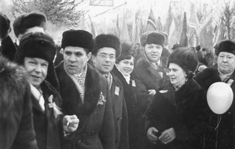 Сохранилось фото с демонстрации 7 ноября то ли 1967, то ли 1968 года. Праздничные шествия два раза в год - в ноябре и мае были неотъемлемой частью жизни. Колонны строились с самого раннего утра.