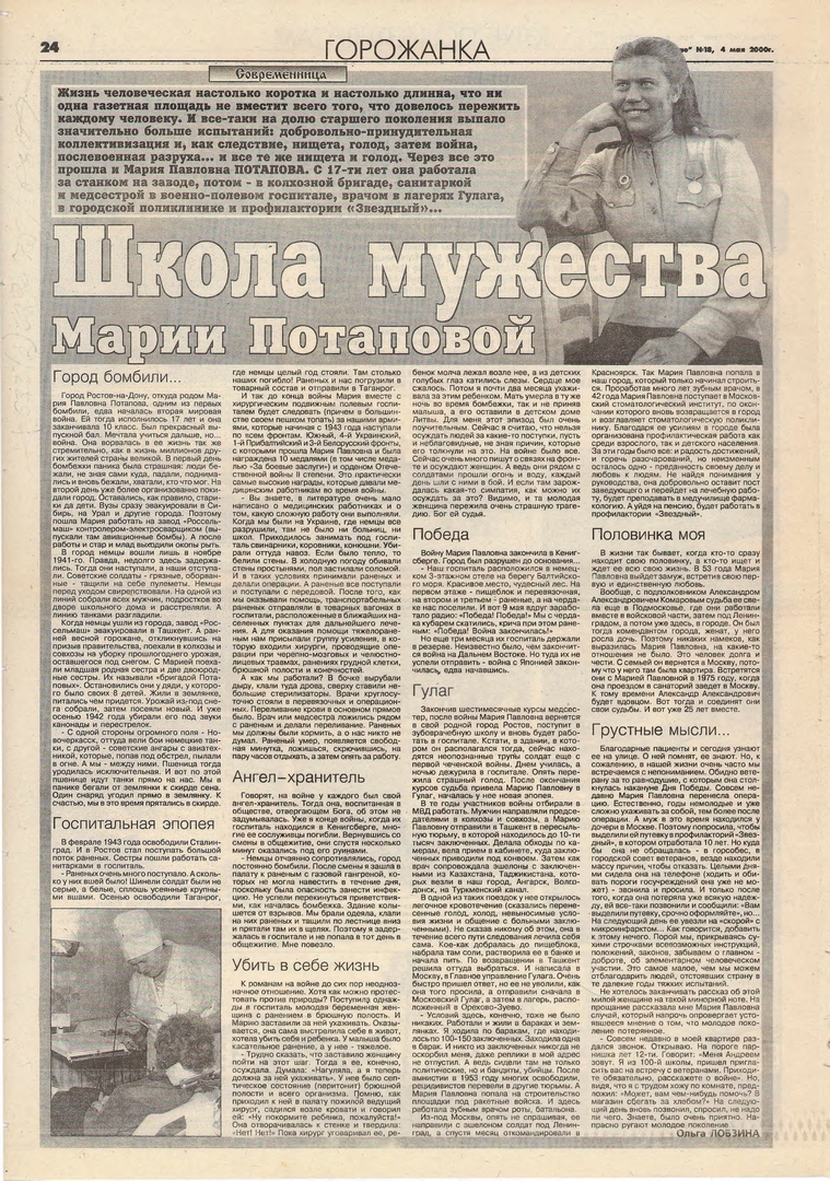В 17 лет героиня статьи узнала, что такое война. Но девушка не сдалась, она боролась и спасала жизни раненых. Я считаю, что это настоящий подвиг, проявление смелости и стойкости характера, ведь немногие смогут перенести такое, заботясь при этом не только о себе, но и о других людях. Как и другие школьники ее времени, Мария Потапова училась, верила в светлое будущее, но ни она, ни ее одноклассники не думали, что однажды их мечты разрушатся. Несмотря на все трудности, голод и страх, девушка находила в себе силы, сохраняла доброту, человечность, сострадание и милосердие. И на фоне жестокости только любовь, которую Мария дарила окружающим, помогла ей остаться в живых.