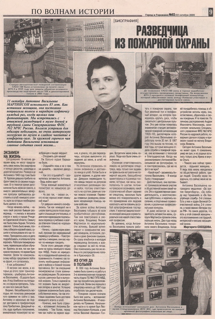 Этот год особенно щедр на юбилеи. 70 лет исполнилось Железногорску и Горно-химическому комбинату. 75 лет Великой Победе, столько же и атомной отрасли страны. 370 лет - пожарной охране России, а министерству РФ по делам гражданской обороны, чрезвычайным ситуациям и ликвидации последствий стихийных бедствий - 30. И в рамках юбилейного года и патриотического проекта газеты мы хотим рассказать о судьбе разведчицы и переводчицы, ветерана Великой Отечественной войны и диспетчере Специального управления ФПС №2 МЧС России Антонине Васильевне Мартинсон.