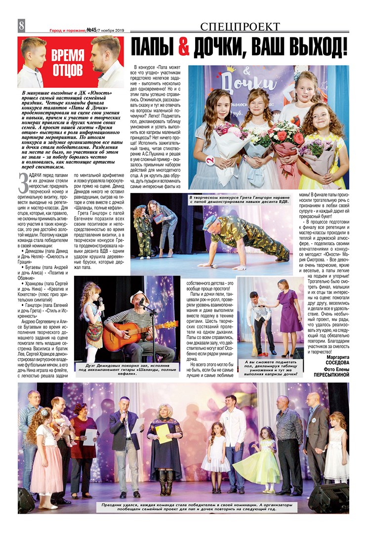 В минувшие выходные в ДК «Юность» прошел самый настоящий семейный праздник. Четыре команды финала конкурса талантов «Папы & Дочки» продемонстрировали на сцене свои умения и навыки, причем к участию в творческих номерах привлекли и других членов своих семей. А проект нашей газеты «Время отцов» выступил в роли информационного партнера мероприятия. По итогам конкурса и задумке организаторов все папы и дочки стали победителями. Разделения на места не было, но участники об этом не знали - за победу боролись честно и волновались, как настоящие артисты перед спектаклем..jpg)