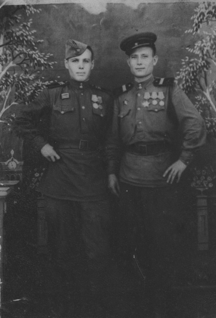 Родился дед (на фото справа) в Казахстане в 1918г. В 1938 году его призвали в Красную Армию и отправили на озеро Хасан, где уже шли бои. О войне дед рассказывать не любил, говорил только, что был «пристрельщиком». Был награжден самой главной, как он считал для себя, медалью «За победу над Японией». Остальные награды находятся у старшего правнука, документы к наградам, фронтовые фотографии и небольшая автобиография хранятся в нашей семье.