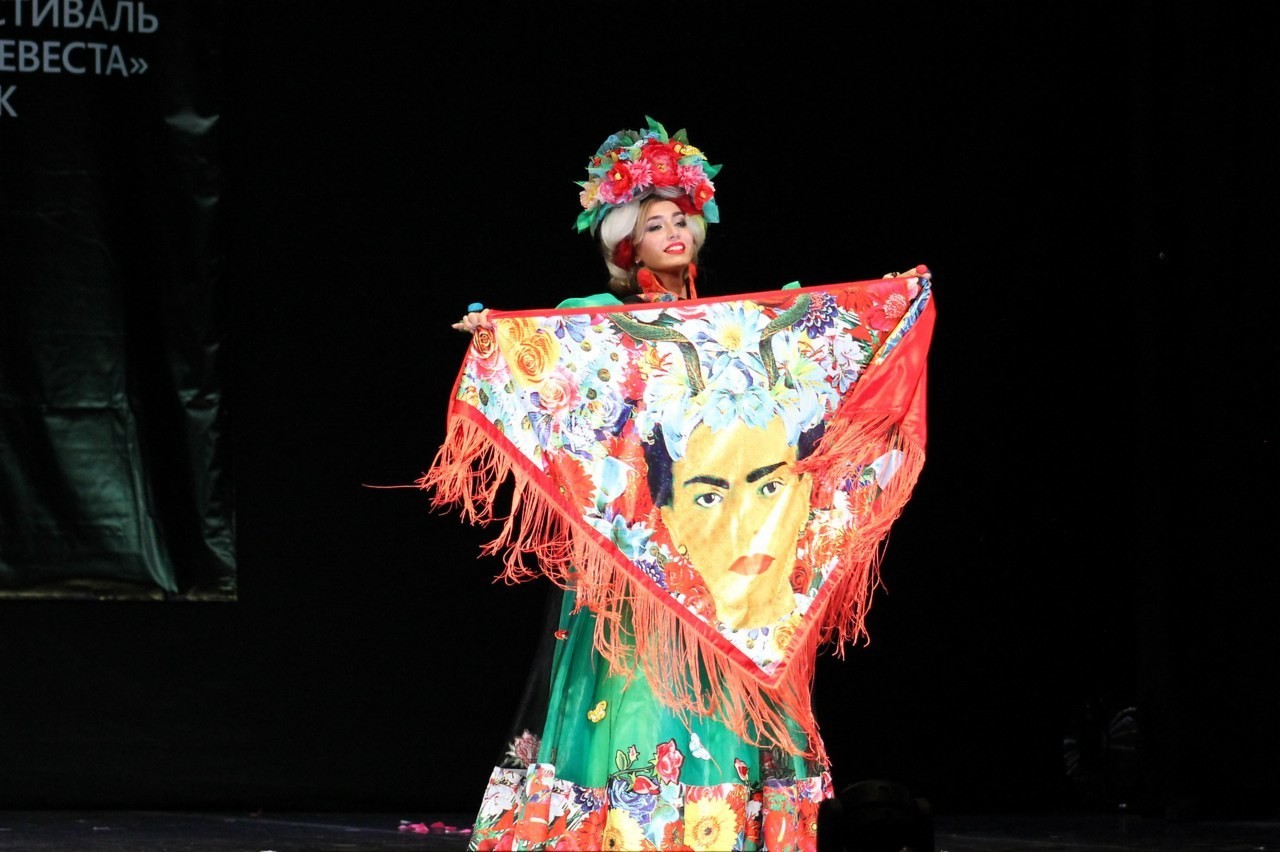 В конце апреля этого года самые красивые и отважные невесты вышли на сцену городского Дворца культуры, где соревновались в трех конкурсах: «Презентация», «Стилизация свадебного костюма» и «Признание в любви». Особенно ярким и запоминающимся получился выход нашей героини, когда она предстала перед зрительным залом в образе мексиканской художницы Фриды Кало.