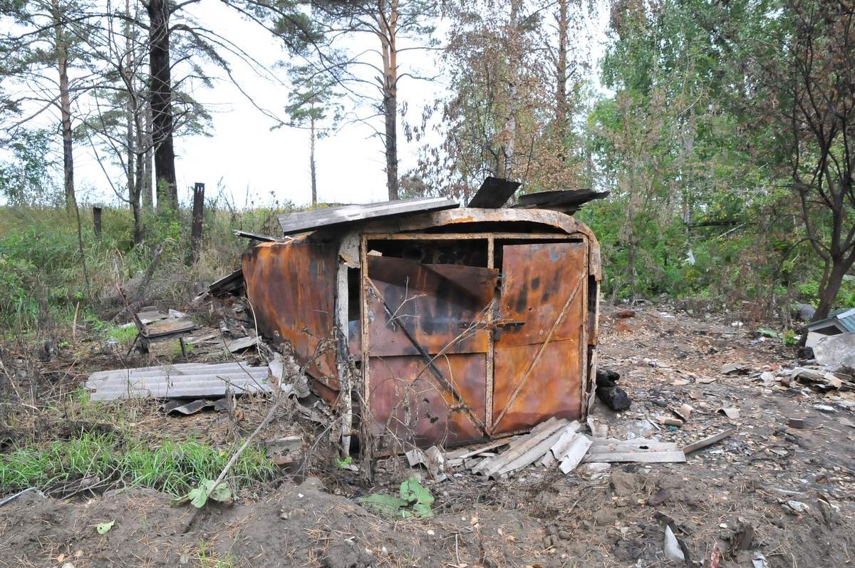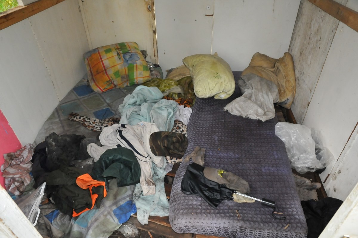 Сарай два на полтора, сколоченный из фанеры, - жилище Шрама, по его словам, еще недостроенное. В нем засаленный матрац вперемешку с грязными тряпками, на стене номер 38 и табличка «Посторонним вход запрещен». Возле дома печка-буржуйка и ящик, служащий столом. На нем крупа в упаковке, подгнившие фрукты и овощи. Вокруг разбросаны кухонные принадлежности и инструменты.