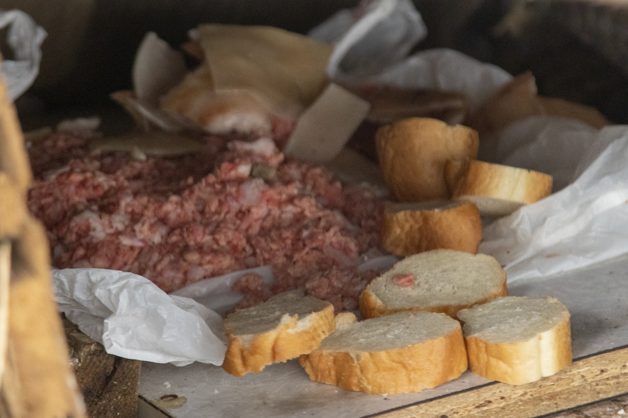 Численность стаи постоянно меняется. В настоящее время, как нам сказали, в этом лесу живет 14 особей. И их постоянно подкармливают. Мы встретили на тропинке, ведущей к собачьим домикам, двух пенсионерок. Одна возвращалась из леса, а другая туда направлялась. В одной из будок мы увидели мясной фарш - совсем свежий, видимо, только принесенный.