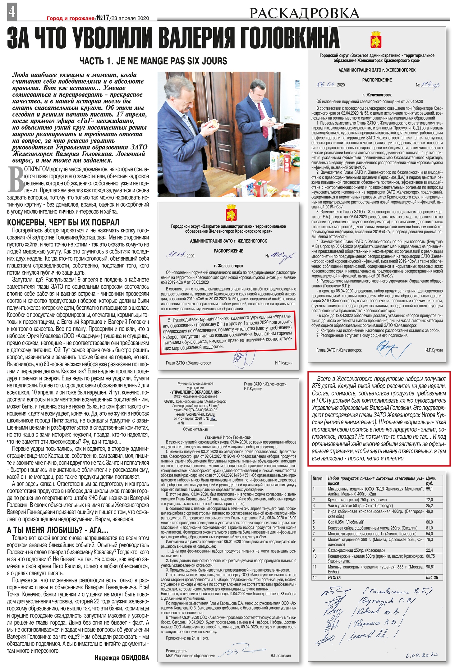 А вот здесь капкан. Ответственным за подготовку и контроль соответствия продуктов в наборах для школьников главой города по решению оперативного штаба КЧС был назначен Валерий Головкин. В своих объяснительных на имя главы Железногорска Валерий Геннадьевич признает ошибку и пишет о том, что сожалеет о произошедшем недоразумении. Верим, наверное.