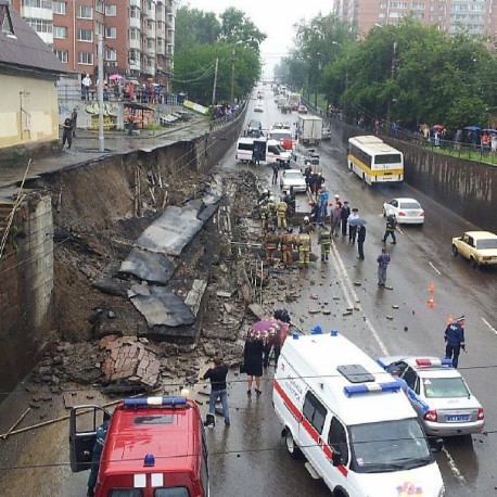 Череда обрушений в краевом центре даже самые инертные мозги заставит шевелиться. Только ли дожди виноваты в том, что 2 августа на Свободном рухнувшая стена убила двоих красноярцев прямо в машине? А всего через пару дней в Академгородке упала еще одна подпорная стена, увлекая за собой в трехметровый овраг автомобили, - тоже дождик виноват? И гражданин на Семафорной улице провалился под асфальт, отбив себе ребра и ободрав бока, исключительно из-за ливня?! А метровые ямы, полные воды, что появились еще в начале лета на Маркса, 49, как раз возле отдела приема граждан Департамента муниципального имущества и земельных отношений красноярской мэрии?