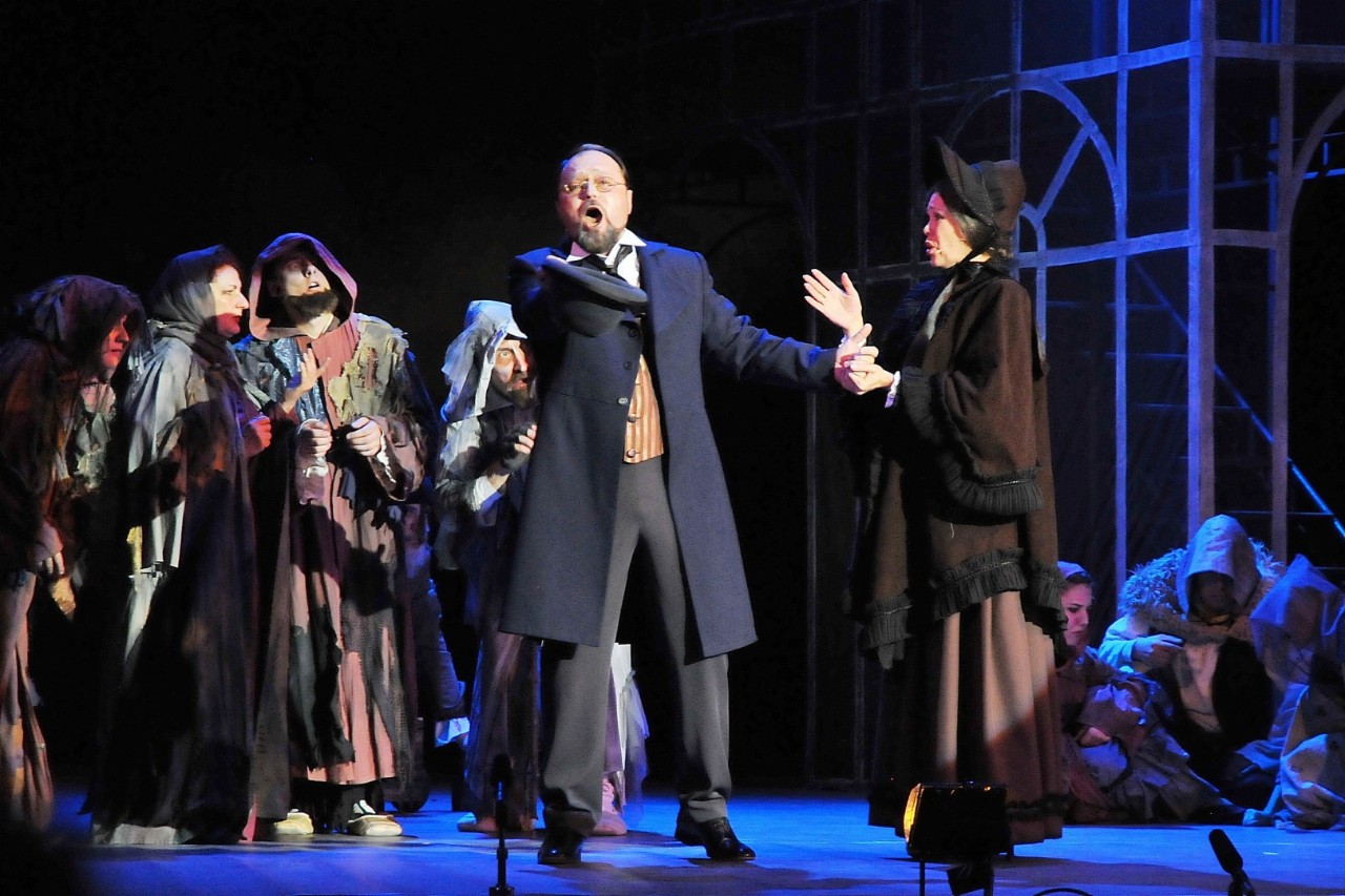Впечатляют и массовые сцены. Хор маргиналов с рефреном: «Подайте!» несколько раз за спектакль появляется на сцене - колоритные нищие, темные личности, словно крысы, вылезающие из всех щелей. Балетмейстер Михаил Лаврентьев постарался сделать стилистику хореографии отчасти авангардной. Чисто балетных номеров здесь немного, да они и не нужны, потому что они вписаны в музыку, как единое полотно. Пожалуй, самой интересной сценой стала песня матери Нелли (Александра Соколова), которая увлекла зрителей и сгладила технические неполадки с микрофоном.