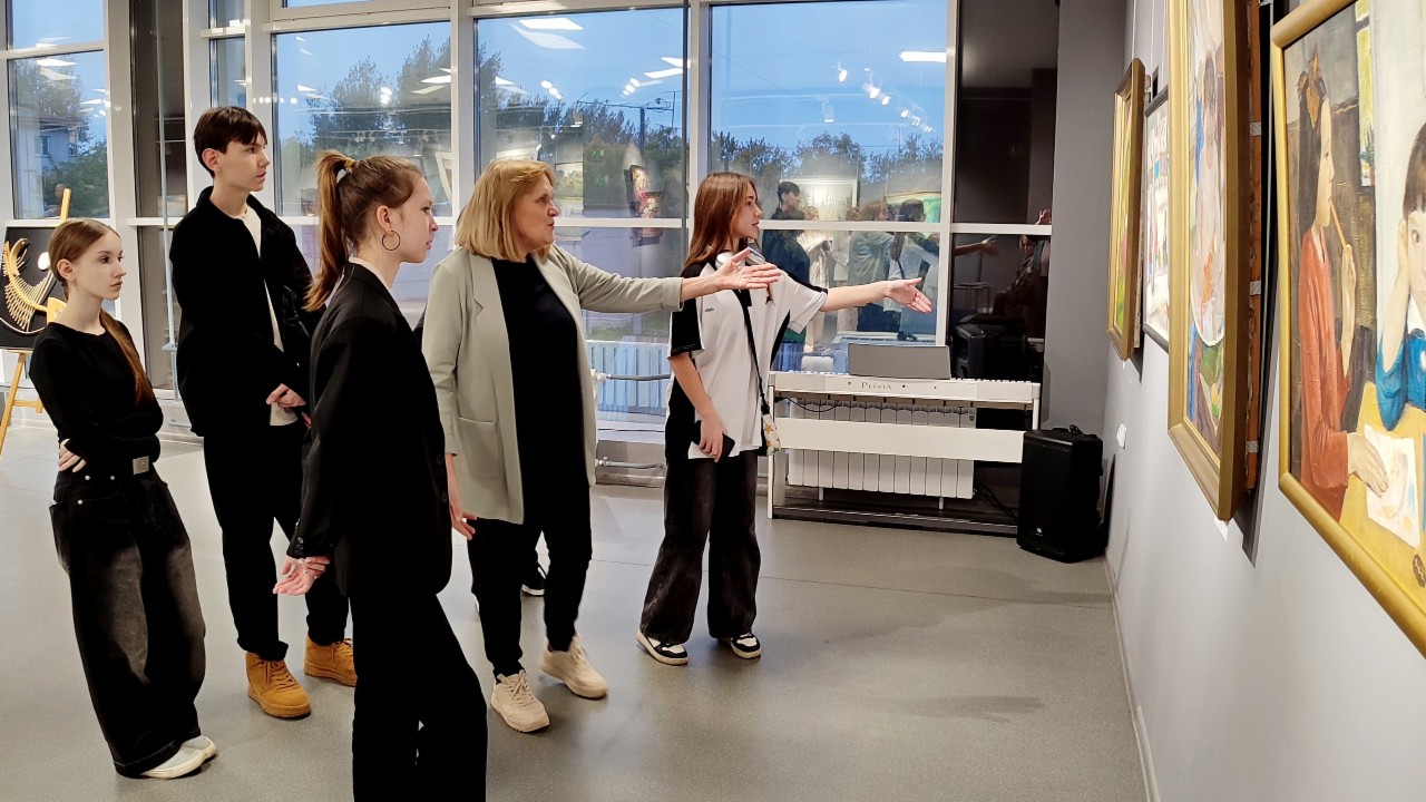 Как раз чтобы набраться опыта и вдохновиться на выставку пришли ученики Детской школы искусств. Вместе с директором Анной Микрюковой у них прошел такой урок живописи: разбирали детали, техники, сюжеты, а также делились впечатлениями.