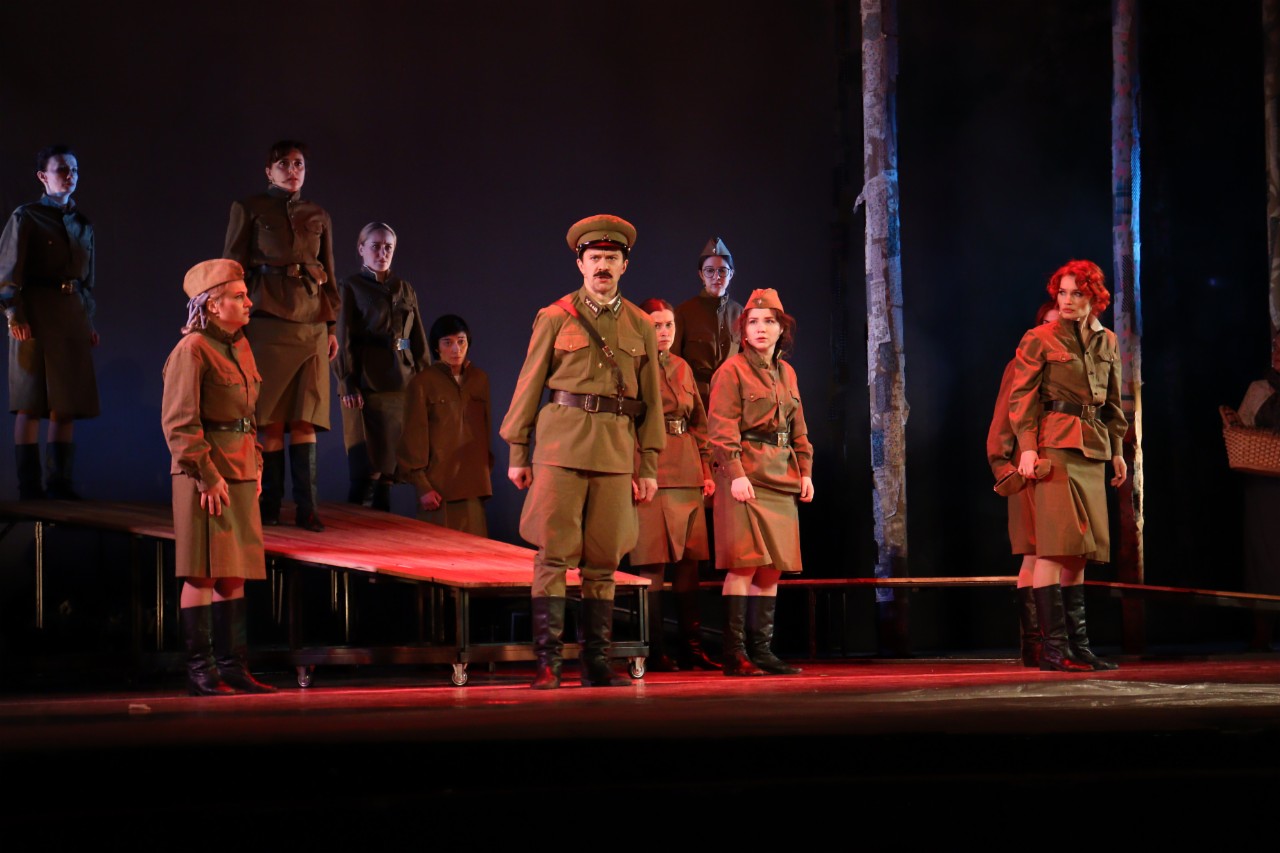Очень точным получилось попадание в образ у актеров – и внешне, и по голосу, и по характеру. Роль старшины Федота Васкова исполнили два артиста. В образе убеленного сединами ветерана предстал Александр Потылицин, а Васкова в молодости сыграл Роман Ридзель, в полной мере показавший свой драматический и вокальный дар. Невозможно было отвести взгляд от рыжеволосой красавицы Жени Комельковой, образ которой темпераментно и ярко воплотила Наталия Рон. Валерия Зеленская была очаровательна в амплуа лирической героини Лизы Бричкиной. Татьяна Ежова сумела передать драматичность судьбы молодой мамы Риты Осяниной. Камилла Абдуллина задорно сыграла роль неунывающей Галки Четвертак. Очень трогательно и нежно прозвучала история Сони Гурвич в исполнении железногорской школьницы Таисии Глухоедовой. Кстати, это был ее большой актерский дебют. Таисия учится в 8 классе Лицея №103 «Гармония», увлекается театром с 6-го класса. Уже сыграла в спектакле «Алые паруса», поет в вокальном коллективе «Пентатоника», ее педагог по вокалу – Антон Кирса.