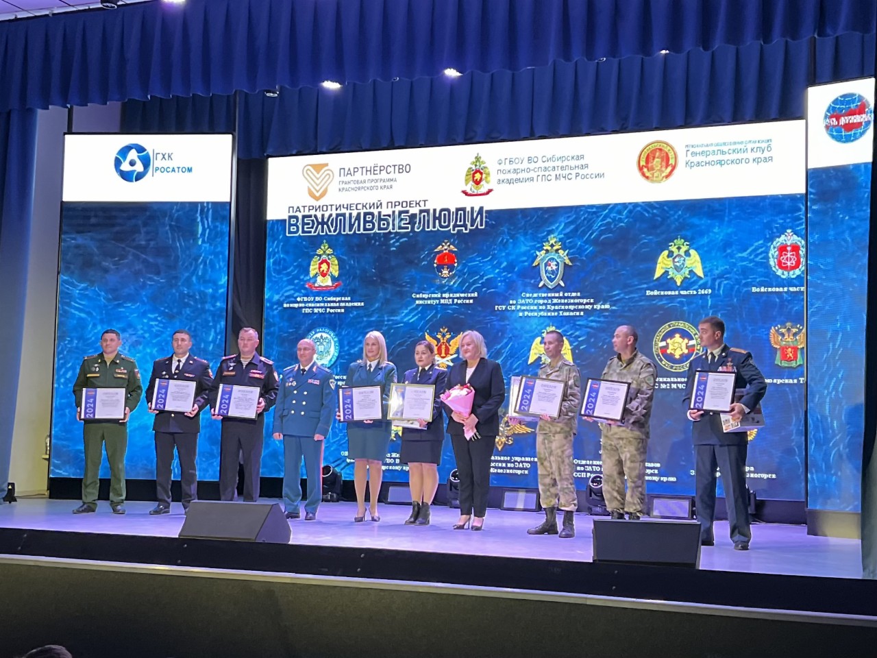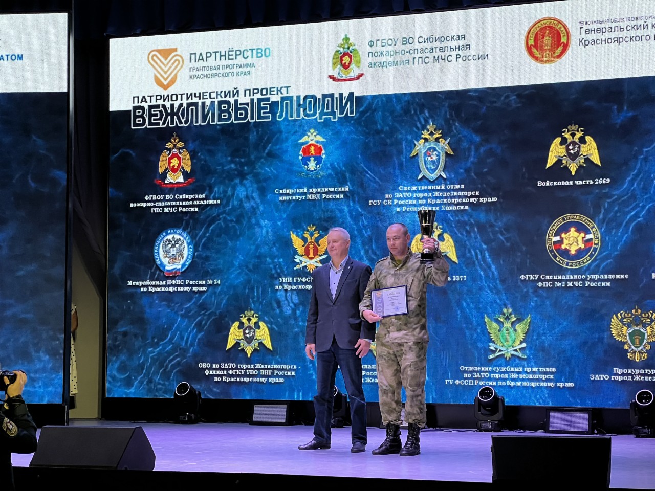 В общекомандном зачете третье место заняли в/ч 3377 и Отдел вневедомственной охраны Железногорска, второе место – команда отделения ГУФССП России по Красноярскому краю, а первое место – МУ МВД Железногорска. Гран-при лично вручила главный организатор и идейный вдохновитель проекта «Вежливые люди» и руководитель АНО «ЦПРГИ «Русь державная» команде СПСА КПС МЧС России Галина Идиатуллина.