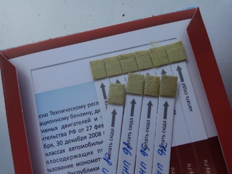 Потом выходим из здания и собственно проводим тест. Он занимает несколько минут. На контрольную полоску необходимо капнуть из заправочного пистолета. Остатки топлива в нем есть всегда.