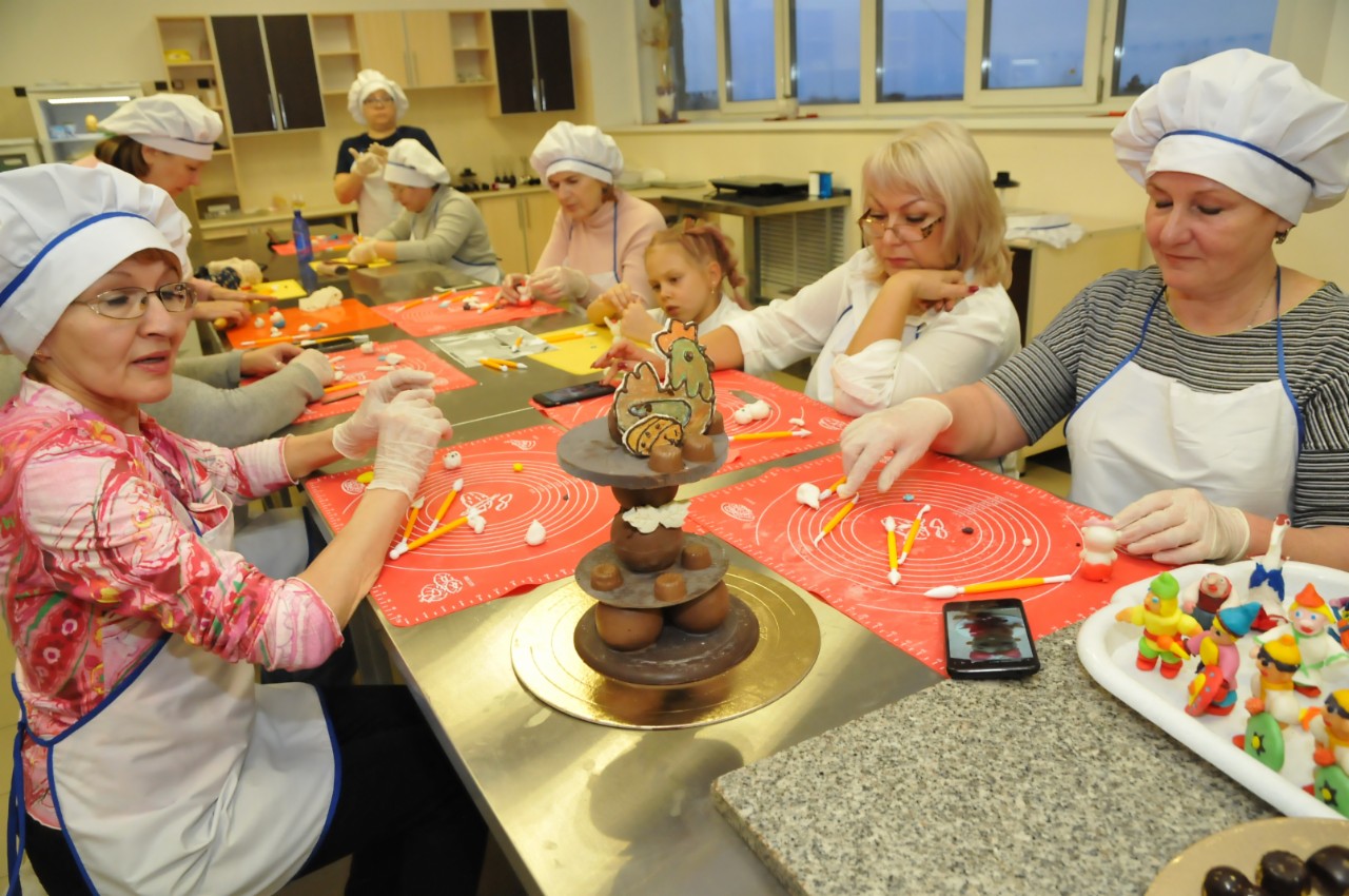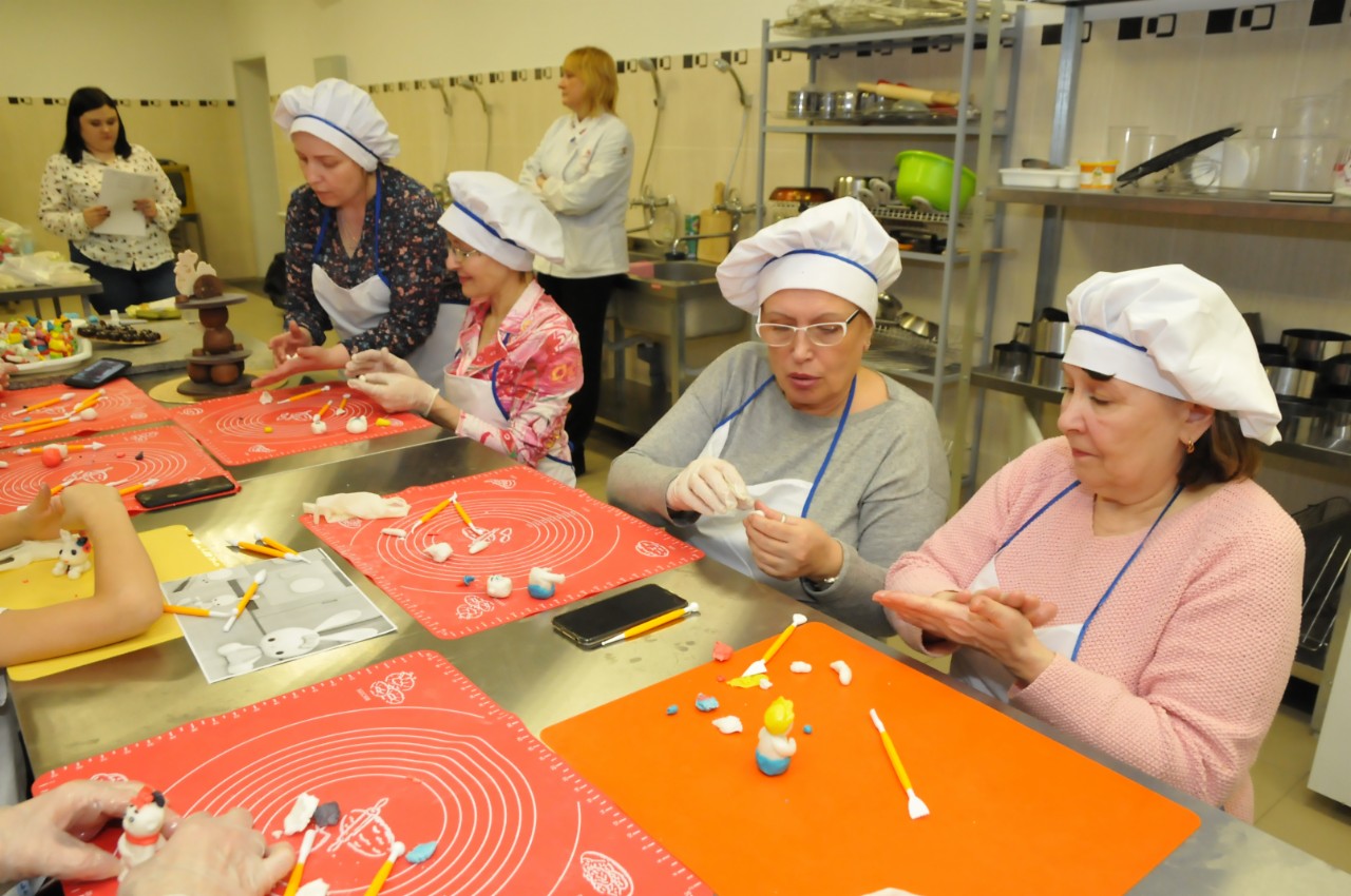 Мы побывали на одном из занятий по обучению кондитеров, которые проводятся для людей пожилого возраста в Техникуме инновационных технологий и сервиса. В рабочем цеху идет занятие по моделированию из мастики. В аудитории 9 человек - обучение проходит по группам не более 10 человек, так положено по стандартам.
