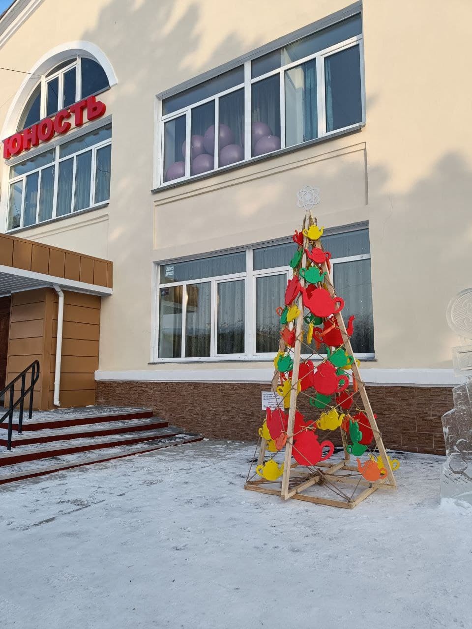 Вторая необычная елка стоит около «Юности» в Первомайском. Сотрудники ДК украсили ее разноцветными чайниками. Арт-елка символизирует теплую атмосферу и гостеприимство учреждения.