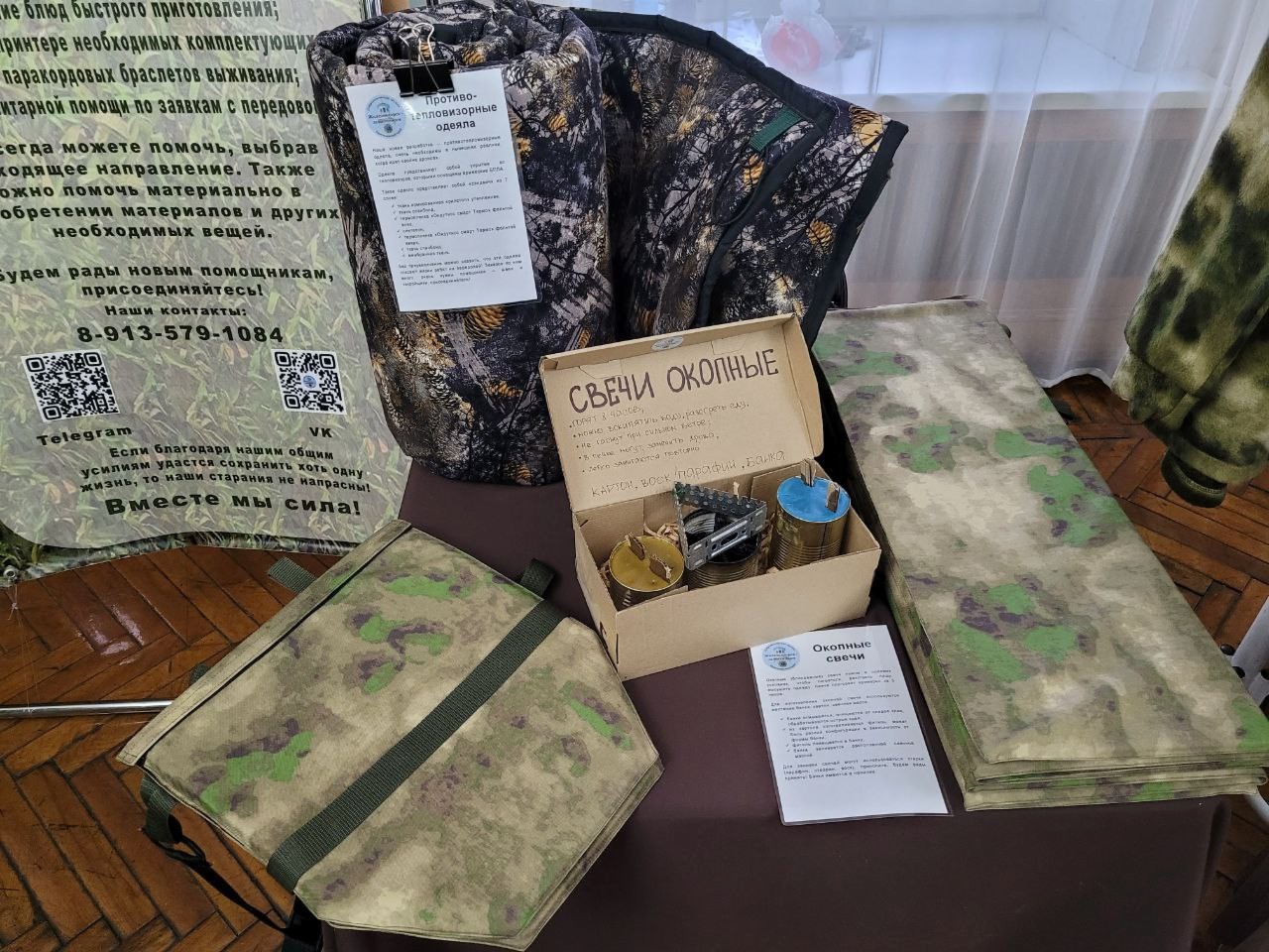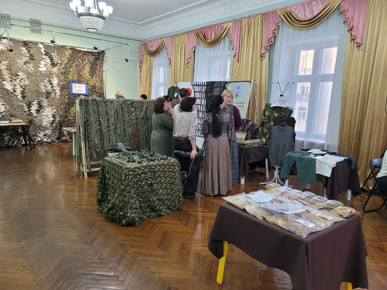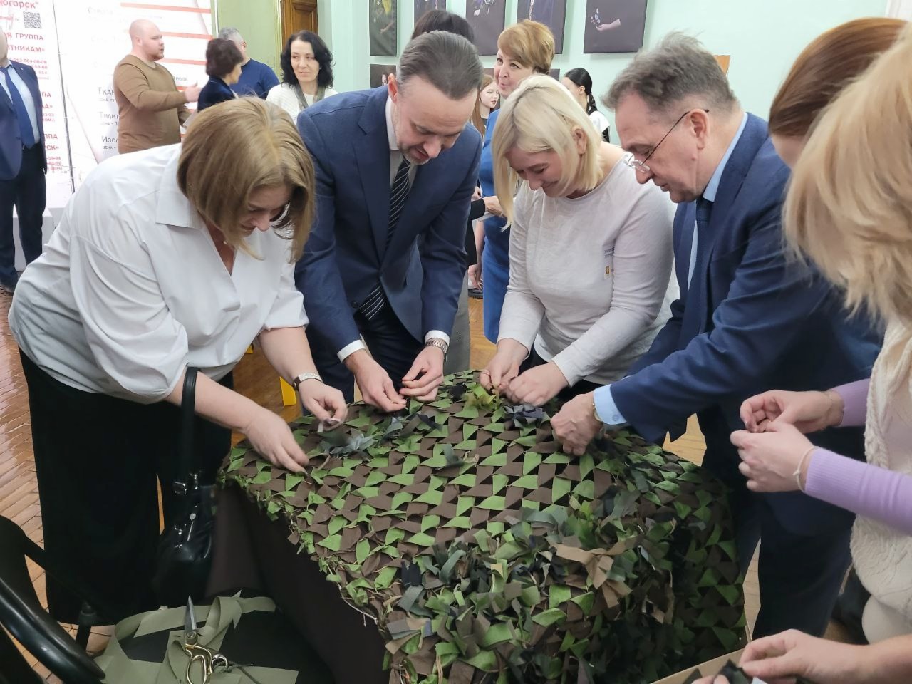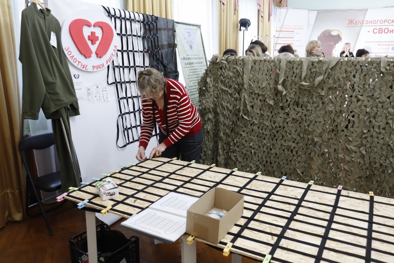 Перед началом основного мероприятия в фойе второго этажа общественные организации провели для посетителей мастер-классы по плетению маскировочных сетей. Там же была расположена фотовыставка «Жены героев. Надежный тыл». Работали волонтеры – объясняли, как можно помочь нашим бойцам с помоью QR-кодов. Кроме того, принимали пожертвования и наличными. За вечер для участников СВО через благотворительный фонд «Железногорск» собрали 18 500 рублей.