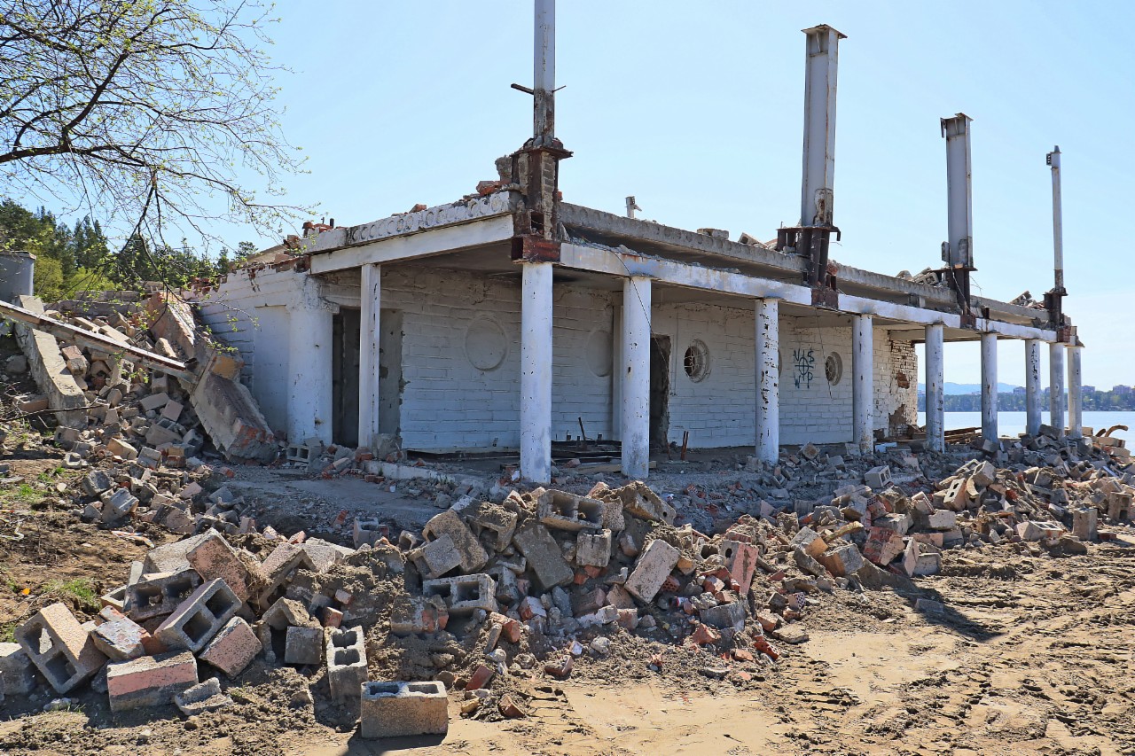 Вид на пляж городского озера со стороны дамбы изменился – со второго плана исчезли псевдоарки кафе «Торнадо». Это здание разрушено. «Ушла эпоха», – грустят одни железногорцы. «Давно надо было этот гадюшник прикрыть!», – радуются другие.