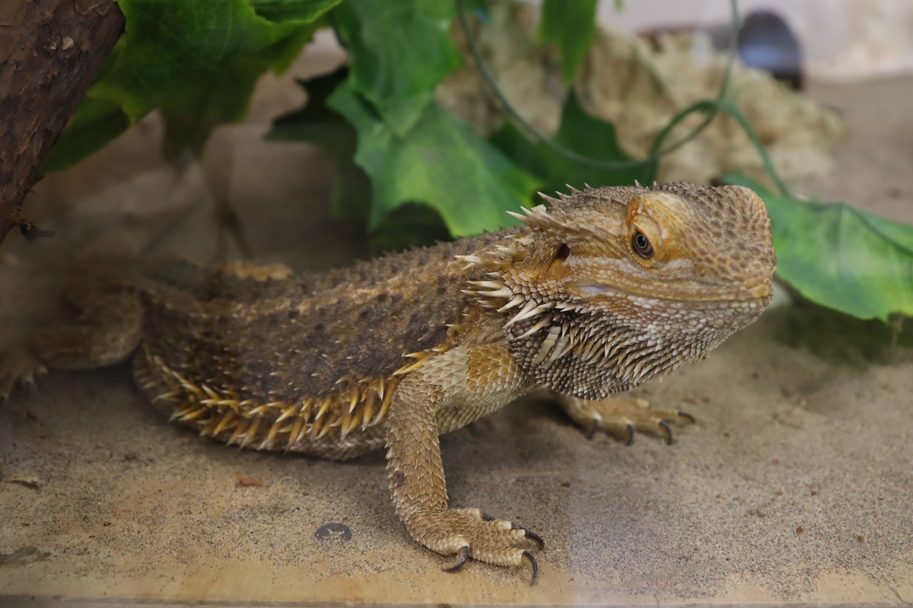 Флегматично взирает на нас ящерица – бородатая агама. Родом эта рептилия из Австралии. Шипы, хотя и кажутся устрашающими, но на самом деле мягкие. Агамы могут менять цвет, в зависимости от температуры воздуха. В зоосаде есть две агамы, но в одном вольере они не ужились. Ящеры, словно динозавры в миниатюре, устраивали настоящие битвы. Когда дрались, их шеи с шипами становились черными! Пришлось рассадить драчунов в разные места.