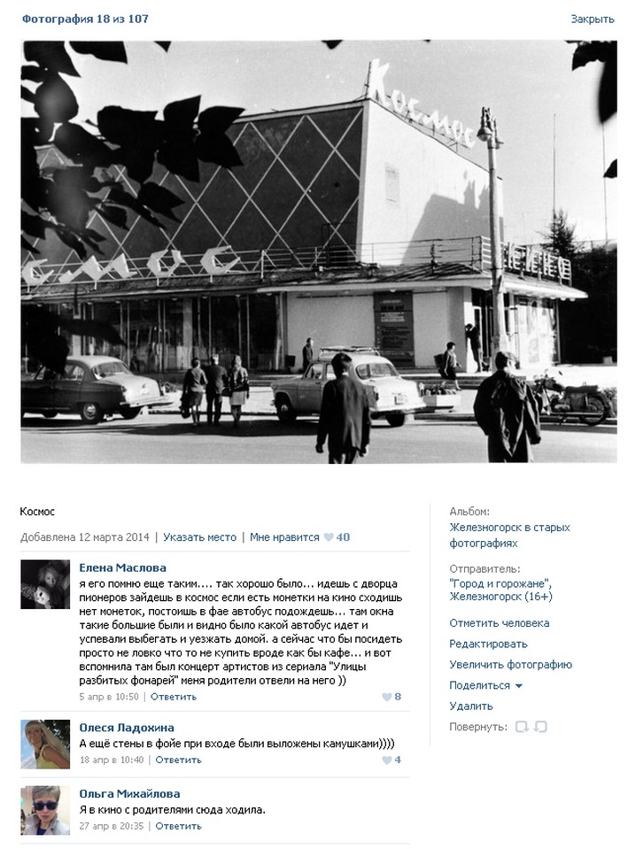 Но одно из самых больших наших открытий – интерес молодежи к архивным фото Железногорска. Той молодежи, что, казалось бы, ничем на свете не интересуется, особым патриотизмом не страдает и живет современными технологиями и ценностями. Но зато с упоением разглядывает старые снимки, пытается узнать знакомые места или просто вздыхает, как же здорово жилось тогда, лет 50 назад, когда самой ее, молодежи этой, еще и в проекте не было!