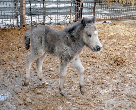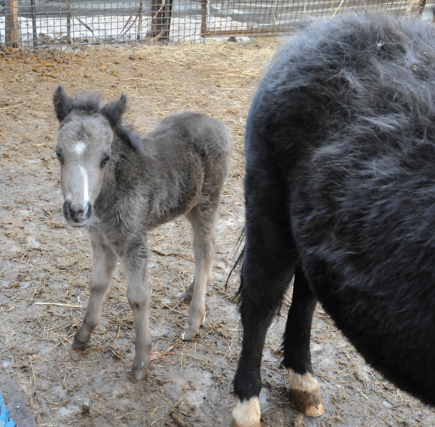 Пони появился на свет спустя три дня после верблюжонка. Он не такой смелый, как его бойкая подруга, к людям подходить пока опасается и постоянно прячется за мамку. Это уже второй ребенок Дэна и Комедии, два года назад они стали счастливыми родителями красавицы Кадрили.