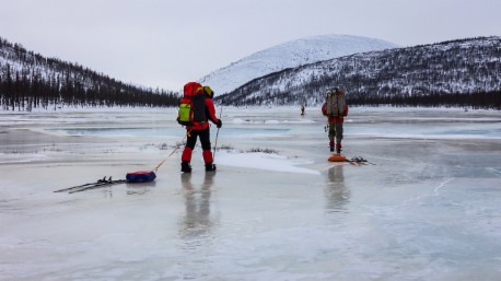За 15 дней они преодолели 241 км по перевалам и каньонам Каларского хребта. Маршрут четвертой категории сложности пролегал через три озера, девять рек, пять каньонов и шесть перевалов. Туристы совершили траверс Каларского хребта и первопрохождение сложного каньона, общий перепад высоты за время похода составил 11640 метров. И все это пешком! Ни тебе вертолетов, ни машин, ни снегоходов. А главное - никаких перевалочных пунктов, деревень или туристических баз. Так что весь багаж от начала и до конца приходилось тащить на себе. Одной только еды на каждого участника выходило около 15 кило, личные вещи и снаряжение тянули еще на 25. На плечах рюкзаки, а позади на веревочке мешки-волокуши с провизией.