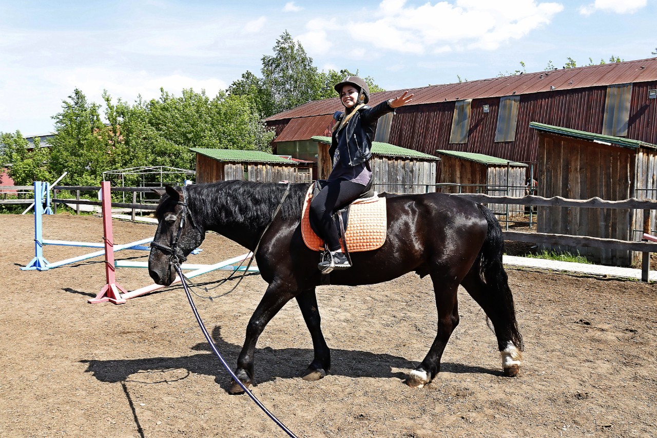 душку-амортизатор и только потом – седло. Подогнали стремена по росту – то есть на длину вытянутой руки. Надели защитные шлемы и выдвинулись в открытый манеж. Испытания начались сразу – нужно взобраться на коня, а это не просто. Затем Зенит двигался по кругу, а я делала простые упражнения: вытягивала руки вперед, вверх, в стороны – это необходимо делать для развития координации и баланса. Затем мне доверили взять повод. С управлением все не так сложно: отводишь руку с поводом влево – конь поворачивает, вправо – идет в эту сторону. Чтобы остановиться, нужно дважды аккуратно потянуть повод на себя. Получилось почти сразу. Снова шагом, для этого сжимаем бока Зенита внутренней частью голени. После нескольких минут в шаговом темпе пробуем движение рысью. Ощущения непередаваемые! Вот здесь четко ощущаешь, какая сила в этом животном! Последнее испытание – слезть с лошади. Нужно было сильно закинуть правую ногу вверх и назад. Но у меня не вышло, зацепилась за седло и немного растянула ногу. Но теперь точно знаю, как нужно это делать. Одно могу сказать точно – конный спорт – это интересно!