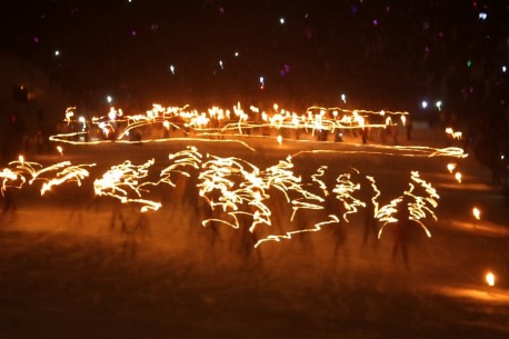 Изменилась в этом году и основная программа катания. К уже привычным ангелам (как же хорошо, что их шестеро, а не четверо!) присоединились разноцветные бабочки и человечки, которые при пересечении траекторий обращались в красные сердца! Фаерщики тоже дали столько огня и дыму, что могли поспорить с небольшой мартеновской печью. Толпа, собравшаяся внизу, многоэкранно фиксировала происходящее на записывающую аппаратуру всевозможных типов. Казалось, еще немного и электрическое шоу затмит огненное на склоне.